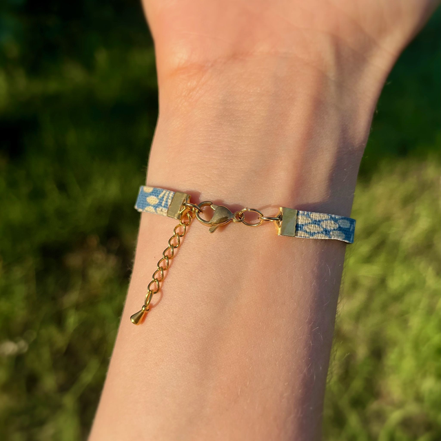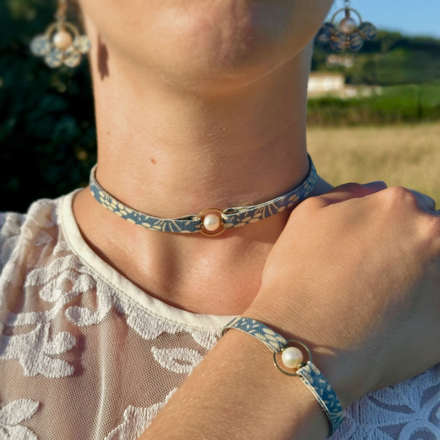 Bracelet Aura#1 - tissu bleu, perle d'eau douce, acier inox