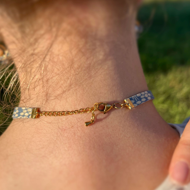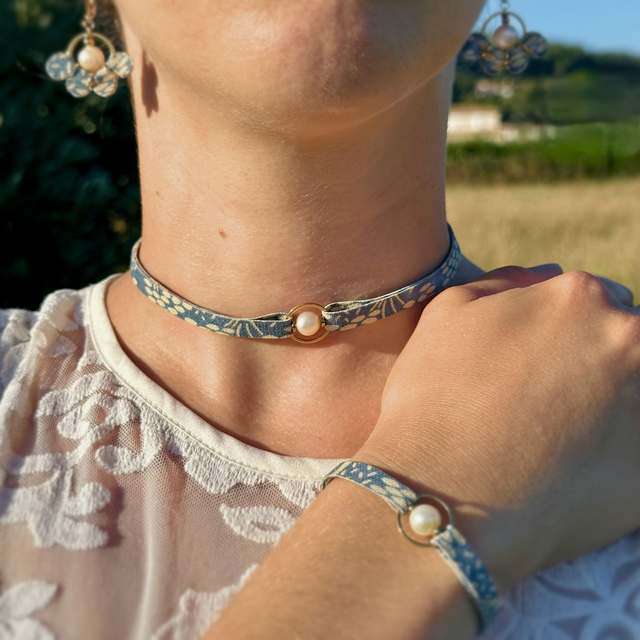 Collier Aura#1 - tissu bleu, perle d'eau douce, acier inox