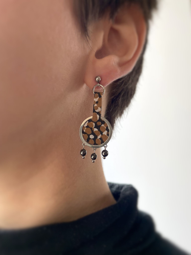 Boucles d'oreilles upcyclées - tissu moucheté noir, caramel et blanc et pierres hématites